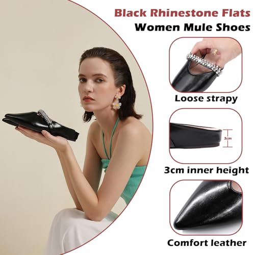 Women's Rhinestone Pointed Toe Mule Flats – 2cm Inner Height Increase, Backless Ballet Slippers for Work, Parties & Shopping