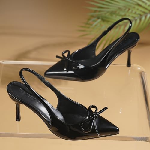 Women's Pointed Toe Slingback High Heels - 3.14 Inch Stiletto, Glossy Patent Leather with Bow Decor, Elegant Dress Shoes for Evening, Party & Formal Occasions